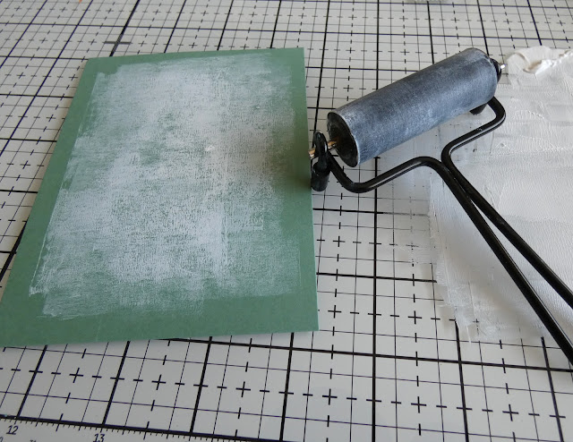 I trimmed Simon Says Sage Cardstock to 4" 5.1/4" and applied a light skippy coat of White Gesso using Tim Holtz Distress Small Brayer.