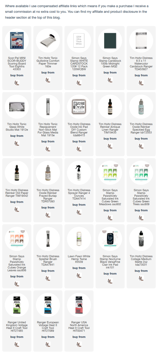 I created a card using the Printmaking Leaves 6" x 8" stamp set from the release and Pawsitively Saturated Mini Ink cubes. The stamp set includes a stamp builder guide which makes it so easy to layer each image.I trimmed Distress Watercolor card to 3.3/4" x 5" and coloured using a Distress Custom Blend Ink Pad (the colours are linked below).I inked each of the 3 leaf stamps with a different colour of Pawsitively Saturated Mini Ink Cubes - Sprout, Field and Pine and Mocha for the 4th stamp with the stems.