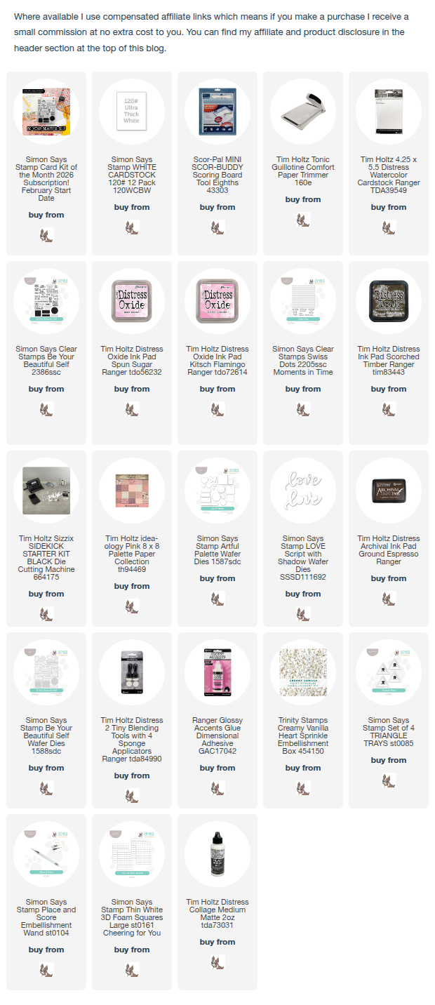 I created a Valentine's Day card using the Be Your Beautiful Self stamp set, Artful Palette Wafer Dies and Tim Holtz/Idea-ology Pink Palette Collection papers from Simon Says Stamp February Card Kit along with the Swiss Dots Clear Background stamp and Love Script Wafer Dies.