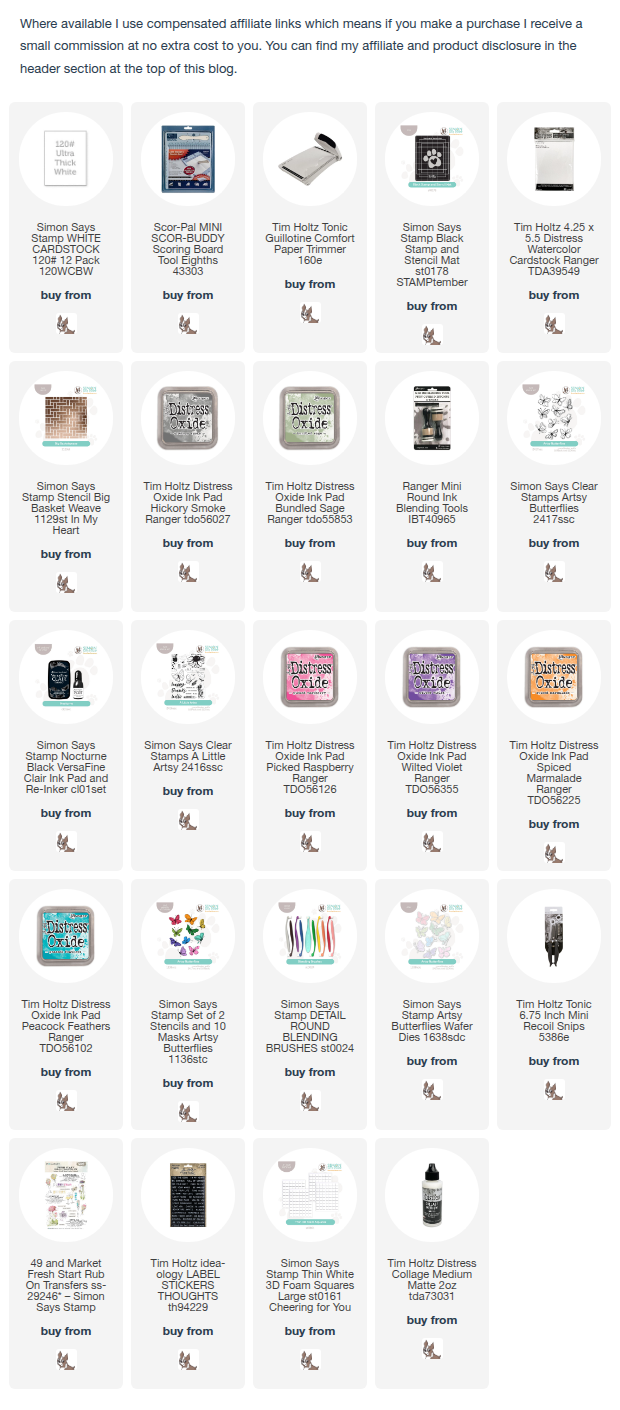 I inked around the edges of the panel with Picked Raspberry and Peacock Feathers Distress Oxide inks. I coloured the butterflies using Simon Says Stamp Artsy Butterflies Stencils/Masks, Simon Says Detail Round Blending Brushes with the same 4 colours of Distress Oxide inks and added Simon Says Stamp Pawsitively Perfect Black Splatter.
